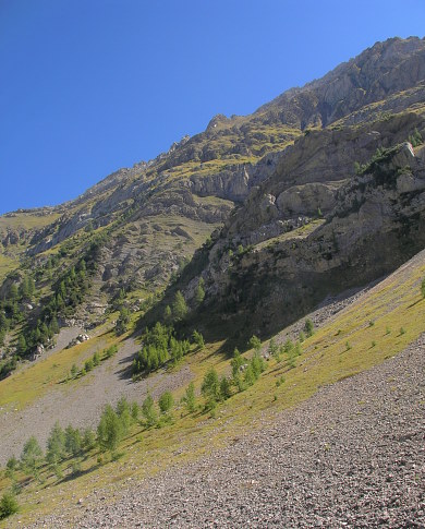 06.09. 2011: Drüben auf der gegenüberliegenden Talseite die Strasse von Aven nach Derborence. - Bild rechts: mein Wanderweg nach Derborence, zu Beginn noch breit und befahrbar, dann so schmal, dass er mit Seilen gesichert werden muss. | |||||||||||||||||||||||||||||||||||||||||||||||||||||||||||||||||||||||||||||||||||||||||||||||||||||||||