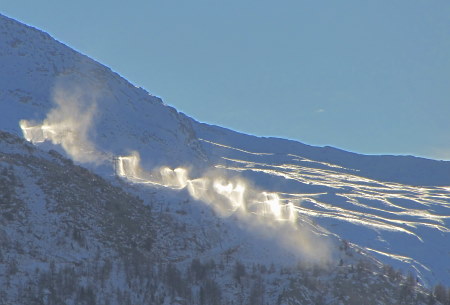 10.12.2011: Zwei Tage später habe ich noch in Saas Fee zu tuen. Stolz bemerkt man im Tourismus-Office, dass man hier ja Schnee hat. - Oberhalb von Saas Almagell laufen zur Sicherheit die Schneekanonen. - Am Abend kurz ein stimmungsvoller Sonnenuntergang von unserem Garten Richtung nördlich vom Simplon. * * Früher hätte man für so etwas erzählt: ** * * da backen die Engelein für Weihnachten. ** | |||||||||||||||||||||||||||||||||||||||||||||||||||||||||||||||||||||||||||||||||||||||||||||||||||||||||