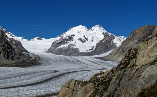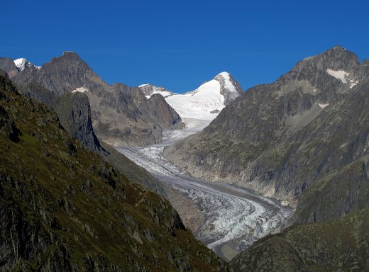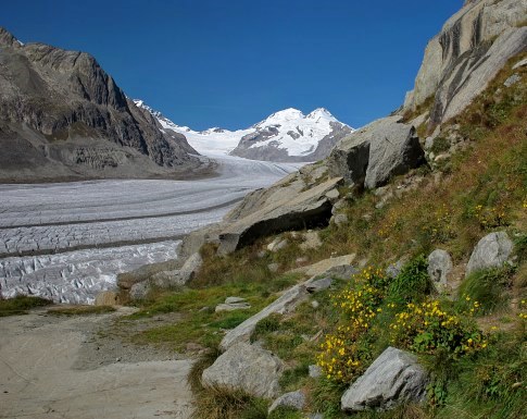 23.09.2014: Von Märjela weiter auf fast flachem Pfad zum Aussichtspunkt *Platta*, eindrückliche Sicht auf den Aletschgletscher bis zum Jungfraujoch, trotzdem treffe ich hier nur drei Wanderer an, die meisten Leute bleiben weiter unten. |