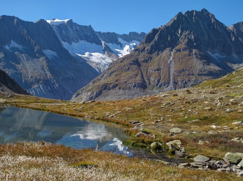 Ein klarer, sonniger Herbstag kündet sich an. So fahre ich mit dem frühen Bus und Bahn nach Fieschertal. Noch liegt im Schatten Reif auf den Wiesen. Durch den Wald hinauf zur Burghütte (1750 m), dort empfängt mich der Hüttenwirt freundlich, und wir plaudern länger miteinander. Auf dem gut markierten und gesicherten Pfad geht es weiter hinauf mit Tiefblicken zu den Resten vom Fieschergletscher. * Oben auf Märjela geniesse ich den Blick auf den Aletschgletscher. Durch den Tunnel zur Fiescheralp . |
