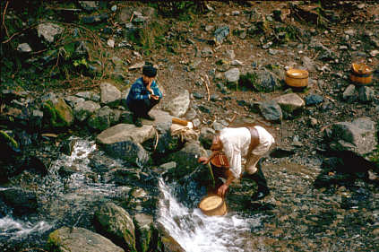 Im Retezat -Gebirge; Hirten waschen den hölzernen Melkkübel neben unserem Zeltplatz. | |