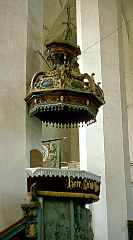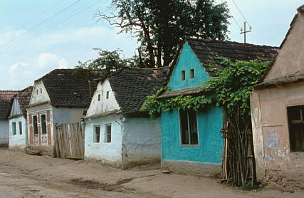 unterwegs nach Birthälm: kleine und grosse Bauermhäuser. darunter: die Wehrkirche von Bierthälm und drinnen die Kanzel. |