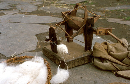 als am einfachen Schulhaus vorbei laufen, kommen die Kinder aus dem kleinen und dunklen Schulzimmer heraus. In einem anderen Dorf steht ein selbstgebautes Spinnrad. In der Zwischenzeit ( bis 2004) hat sich sicher auch hier viel geändert. | |