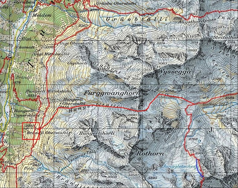von St.Niklaus: Zur Alpe Jungen mit der Seilbahn oder zu Fuss (ca. 2Std. 45 Min.), weiter zur Jungtalalp (2387m), auf Wegspuren zum Rinderalpji-See (2758m) und über Firnfelder auf den Jungpass (2990m), auf Schafweg-Spuren Richtung Hungerli-Oberstafel, von da in ca. 20 Min. zum Brändji-Oberstafel (2297m)